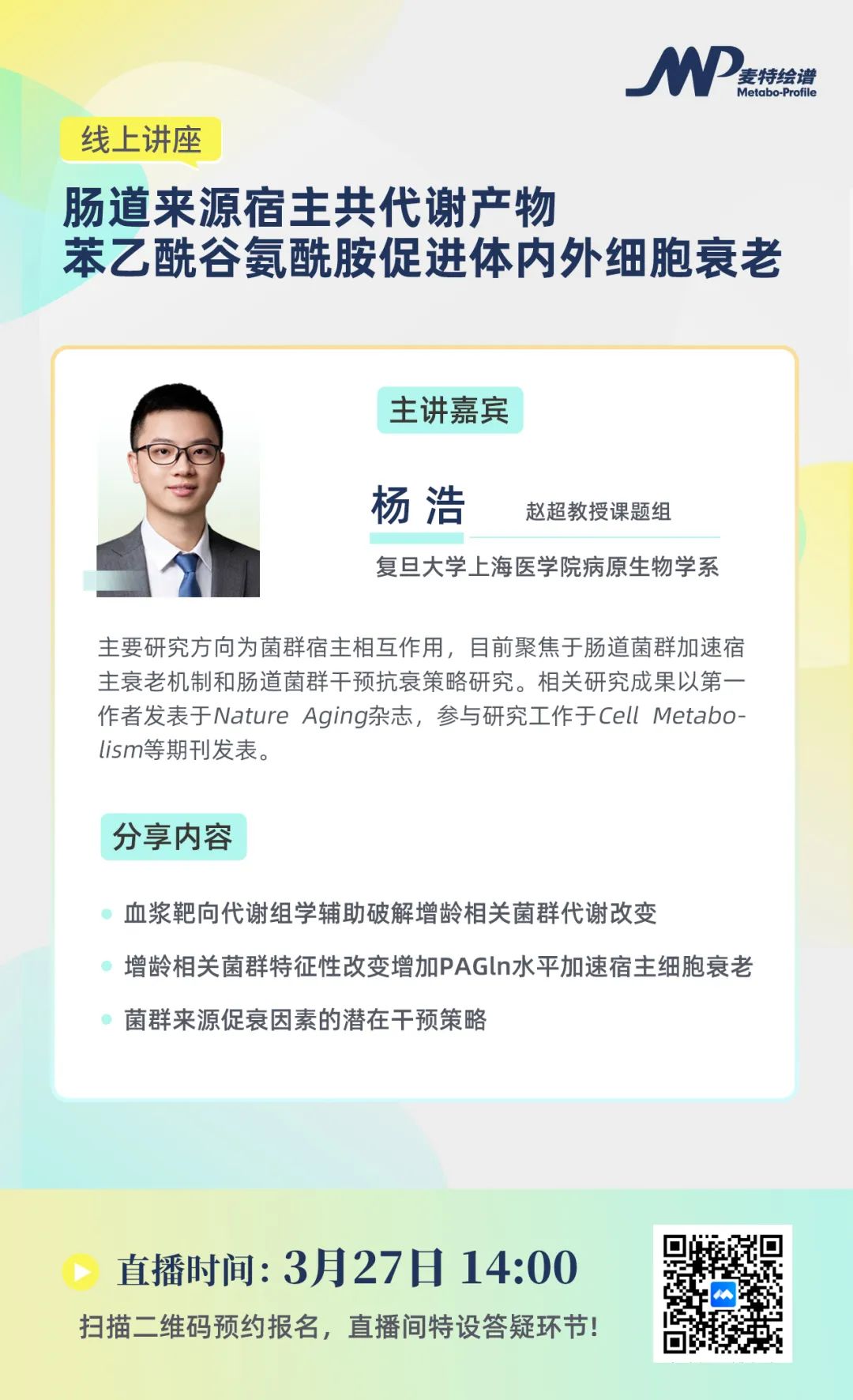 2025年3月27日14:00,麦特绘谱特邀本篇研究第一作者杨浩老师做客绘谱学堂,带来关于《肠道来源宿主共代谢产物苯乙酰谷氨酰胺促进体内外细胞衰老》的主题报告,为各位科研同仁分享此篇文章背后的研究故事。欢迎大家相约直播间,会后特设答疑环节,线上一起探讨研究热点、交流科研观点。