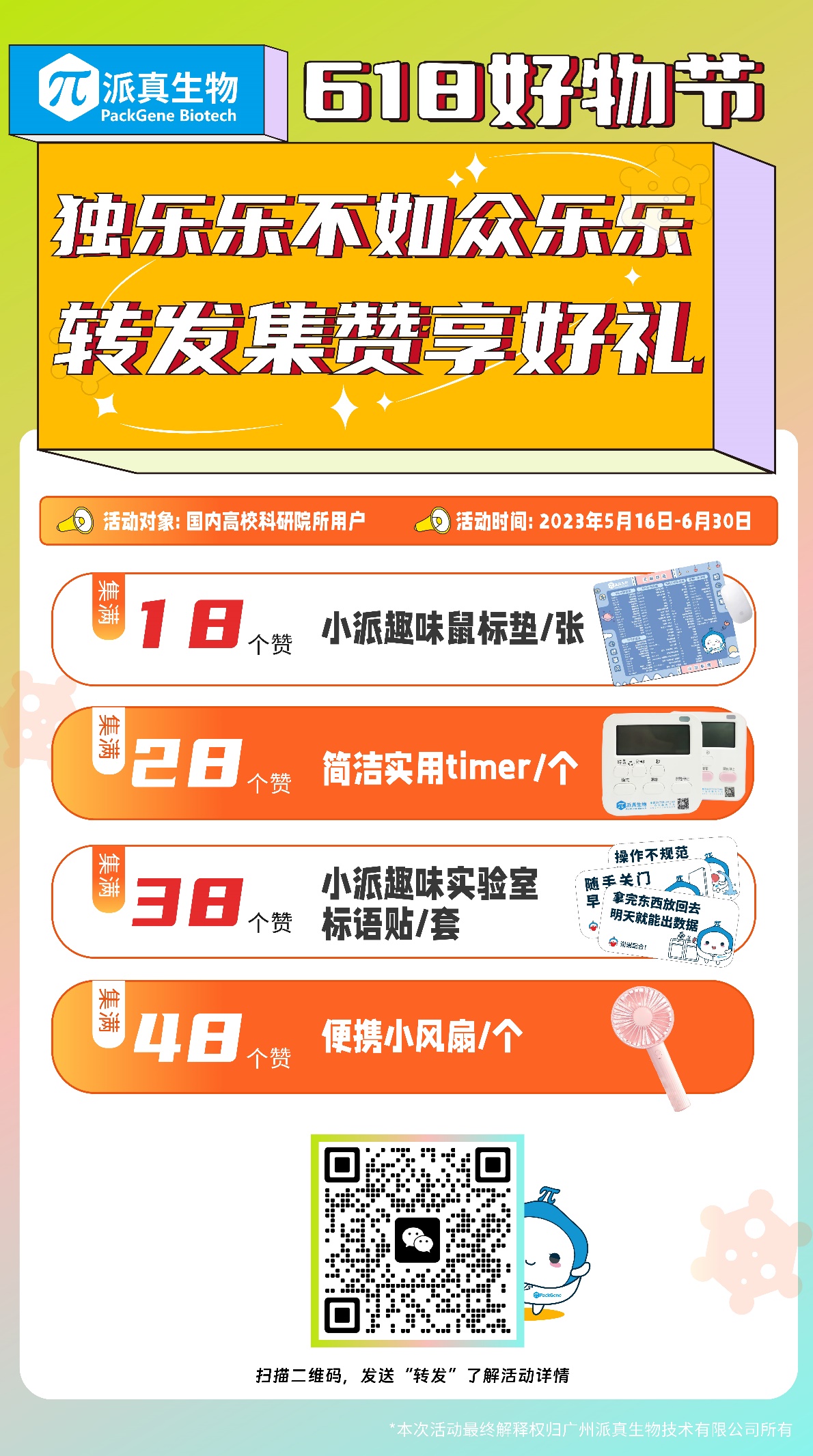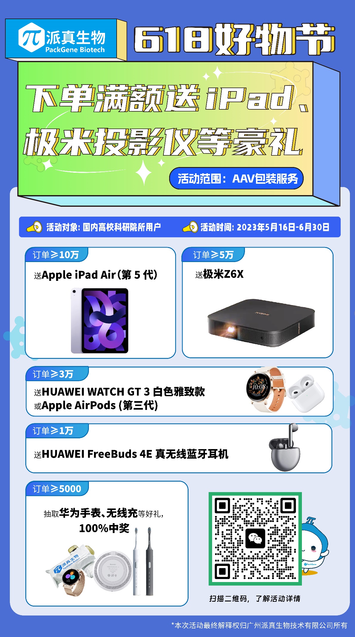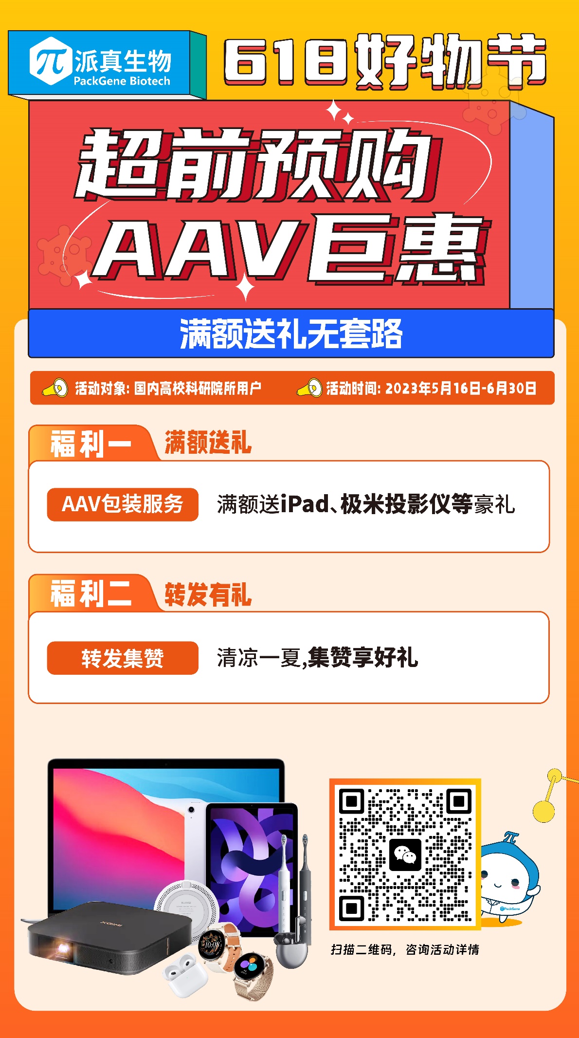 朋友圈转发以下海报,配文字“好品质看得见,AAV病毒包装找派真,快至6-9工作日”不设分组可见保留24h,截图给小派审核通过即可领取奖品;