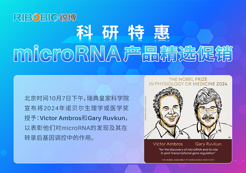 锐博生物对本次获奖的两位学者表示诚挚的祝贺。早在2007年我司就已经推出了microRNA系列功能研究产品与服务,为庆祝microRNA摘得2024年诺贝尔生理学或医学奖,并进一步支持和回馈国内外专注于microRNA研究的科研工作者,锐博生物在线平台重磅推出miRNA系列产品与服务特价促销活动,欢迎咨询订购!