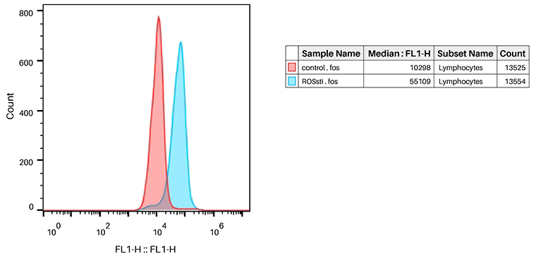 | MHCC97H细胞未经处理或用20μM的ROSsti诱导细胞30分钟后,用DCFH-DA细胞活性氧检测试剂盒染色,然后用流式细胞仪进行检测。结果显示,DCFH-DA能够被活性氧氧化成带有绿色荧光的DCF,正常的MHCC97H细胞中活性氧较低,因此具有较低水平的DCF;而使用ROSsti诱导后,细胞内活性氧增加,因此DCF水平显著增加(荧光主峰向右发生偏移)。 |