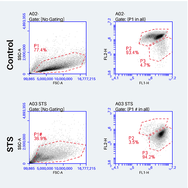 | HeLa细胞未经处理(Control组)或用1 μM的十字孢碱处理细胞4小时(STS组),用JC-1线粒体膜电位检测试剂盒染色后进行流式细胞术检测,其中FL2通道检测JC-1聚合物红色荧光信号,FL1通道检测JC-1单体绿色荧光信号。结果显示,与Control组相比,STS组红色荧光信号减弱,绿色荧光信号增强,表明线粒体膜电位降低,凋亡细胞增加。 |