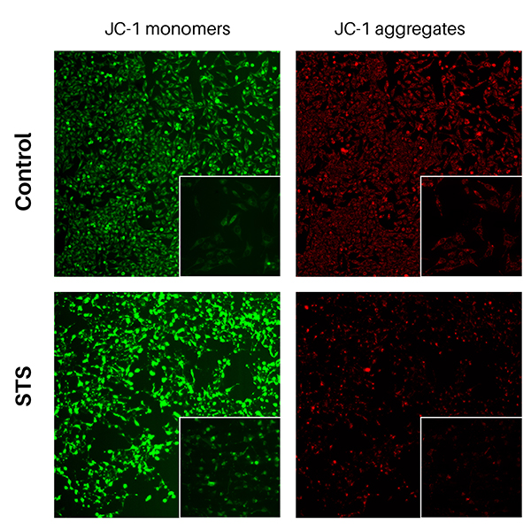 | 在未经处理的HeLa细胞(Control组)中JC-1以聚合体形式存在于线粒体基质中,主要发出红色荧光;细胞经1 μM的十字孢碱药物处理后(STS组),线粒体膜电位下降,JC-1以单体形式游离于细胞质中,主要发出绿色荧光。