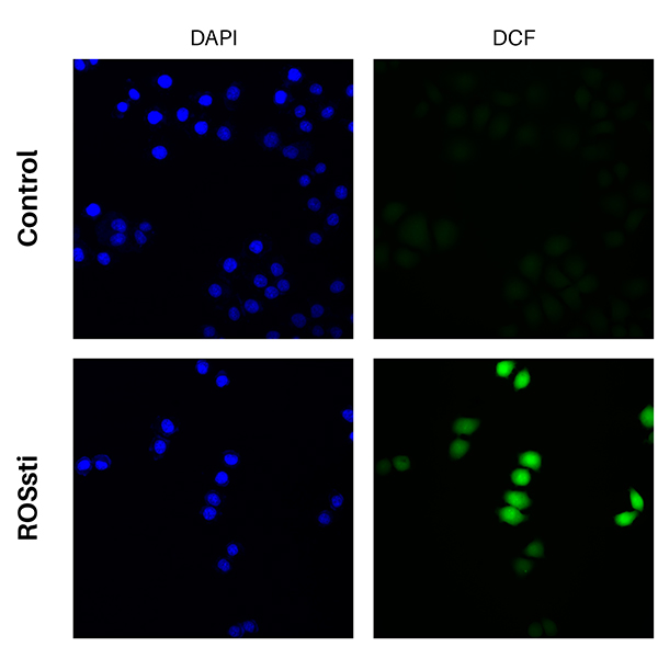 | MHCC97H细胞未经处理或用100μM的ROSsti诱导细胞2h后,用DCFH-DA细胞活性氧检测试剂盒染色,然后用荧光显微镜进行检测。结果显示,正常MHCC97H细胞线粒体中活性氧较低,绿色荧光很弱;而使用100μM的ROSsti诱导细胞2小时后,细胞内活性氧将DCFH氧化为DCF,观察到较强的绿色荧光。 |