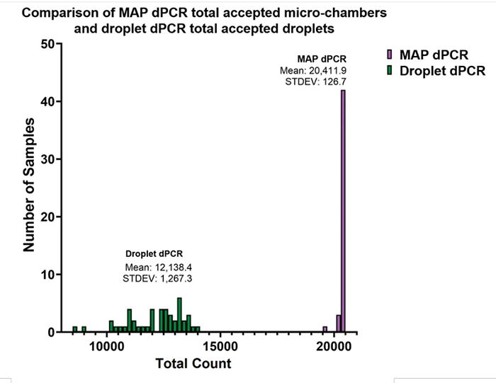 利用 MAP阵列式芯片板技术,每次反应可分析 95% 以上的反应体系,而其他 dPCR 平台的分析率只有 25%-60%。
