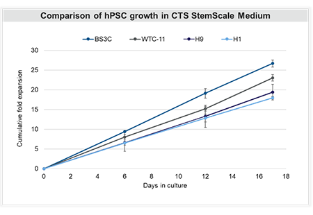 CTS StemScale培养基的一个重要设计元素是其在不牺牲性能的情况下,能够扩增多种PSC系(包括ESCs和iPSCs)。在这里,我们展示了在四个不同的PSC系中,每次传代可实现5-10倍的扩增,展示了它扩增多种来源的PSC系的能力。值得注意的是,扩增效果是与细胞系相关的——一些细胞在悬浮培养中的扩增效果比其他细胞系更有效。