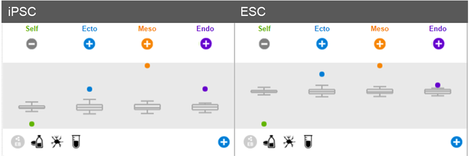 球状体在 CTS StemScale 中成核 1 天,然后使用 Essential 6 培养基自发分化为胚芽谱系。整个球体可以分化,不需要解离成单个细胞。Applied Biosystems™ TaqMan™ hPSC Scorecard Assay 数据表明, 经过3周的分化后,可以实现所有 3 个谱系分化。