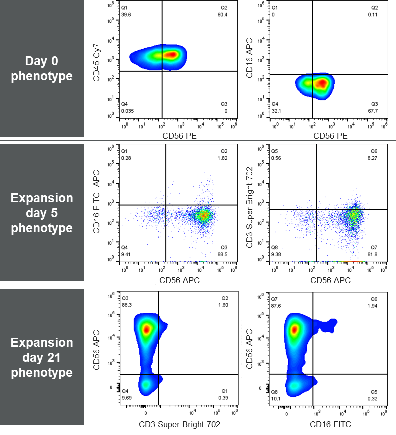 我们使用PSC到iNK分化方案诱导产生了自然杀伤细胞(iNKs),并在NK Xpander培养基中扩增iNKs。左侧的流式图显示了iNK扩增的21天内表型的变化。