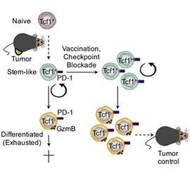 在与病毒或癌症的长期对抗中,精疲力竭的T细胞会逐渐丧失功能,这种状态被称为T细胞耗竭。在当今大热的免疫治疗中,免疫检查点阻断会促进肿瘤浸润CD8+T淋巴细胞的增殖。不过,这种现象背后的机理仍不清楚。瑞士洛桑大学Werner Held领导的研究团队近日鉴定出肿瘤内Tcf1+PD-1+CD8+T细胞,这些细胞表现出干细胞样特征,这些干细胞样细胞在免疫治疗(治疗性疫苗接种、检查点阻断免疫疗法)中对肿瘤的控制起着至关重要的作用。