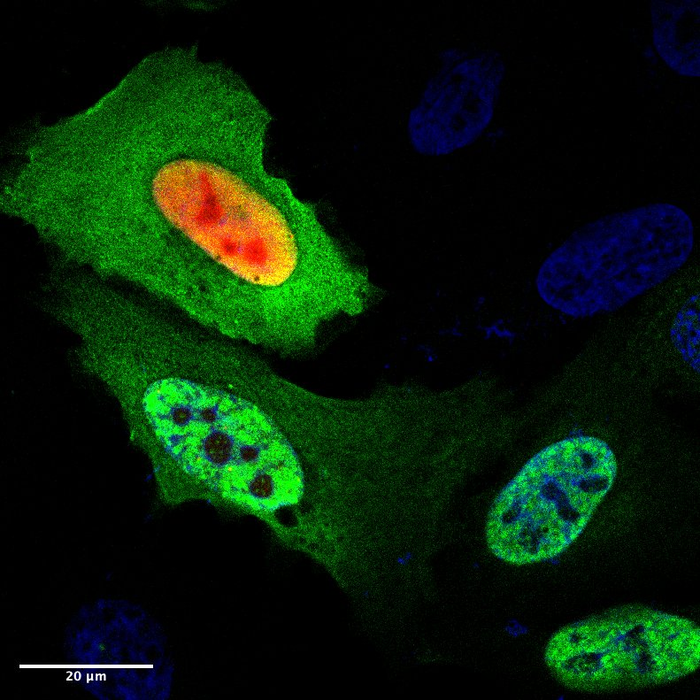 DAXX(顶部红色)阻止与癌症(底部深绿色)相关的突变p53蛋白在细胞中聚集。
