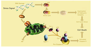 Bax是一种Bcl-2家族的前凋亡蛋白,一般出现在胞浆中,并作为一种细胞损伤和刺激的传感器。响应损伤和刺激,Bax将重新定位于线粒体表面并破坏在正常状态下抗凋亡的Bcl-2蛋白的功能。一般来说,在胞浆中的Bax以单体形式存在,然而在细胞发生凋亡时,与线粒体关联的Bax既可能以无活性的单体形式存在,也可能以与线粒体膜结合的大分子量的活性复合物形式存在。Bax可以构成跨线粒体外膜的孔,并导致膜电位的降低和细胞色素C(Cyt C)及凋亡诱导因子(AIF)的外流,细胞色素C与Apaf-1和ATP及pro-Caspase-9形成复合物(凋亡体)并导致Caspase-9的激活。与细胞色素C的结合使Apaf-1与pro-Caspase-9的结合能力更强。虽然Apaf-1的N端有一个Caspases 1,2,3,4和9所共有的CARD(Caspase Recruitment Domain)域,但由于Apaf-1没有任何Caspase活性,因此可以认为pro-Caspase-9在凋亡体中通过自身酶切反应而被激活。在此机制中,抗凋亡分子Bcl-2及Bcl-XL起阻止线粒体上孔的形成的作用,当Bax与Bcl-2或Bcl-XL时形成异源二聚体时,它就阻断了这些分子的抗凋亡作用。