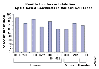 图4. GeneClip™ U1 发卡克隆系统在各种不同细胞系中的效力。图中给出的细胞系是用psiCHECK™-2载体和 pGeneClip™ Basic载体转染的,它们包含一个非特异性或海肾(Renilla)萤光素酶特异的shRNA。使用双萤光素酶报告基因分析系统(Dual-Luciferase® Reporter 1000 Assay Syatem,Cat.# E1980)对海肾(Renilla)和萤火虫萤光素酶的活性进行测定。图中给出了海肾(Renilla)萤光素酶表达抑制的百分比。此为每个细胞类型的单一实验结果。