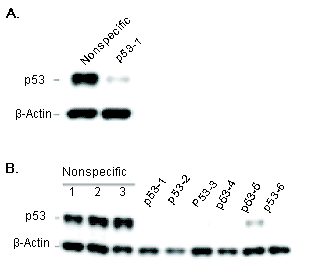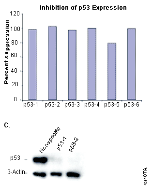 图5. 瞬时转染和稳定克隆中 p53表达的抑制。将pGeneClip™ Basic 载体转染293T细胞。该载体或者包含针对p53的发卡目标序列,或者包含一个非特异性目标序列。48小时后,细胞被收集、裂解,使用BCA(Pierce)分析试剂测定蛋白含量。稳定转染实验种,293T细胞被pGeneOlip™ 嘌呤霉素载体转染,该载体或者包含一个非特异性序列,或者包含一种p53特异目标序列。在实验体系中加入嘌呤霉素,时间为7天,选择稳定转染细胞,对第4代和第11代克隆进行检测。在Western 分析中,每一泳道装加入2μg蛋白,用8%的Tris-甘氨酸凝胶分离,然后转印到硝酸纤维。使用p53 单克隆抗体(Oncogene Research 产品,Ab-2,1:1,000 稀释)和β-肌动蛋白(Abcam,AC-12,1:5,000稀释)检测斑点。使用 ECL™ Plus(Amersham)进行检测。在曝光到胶片之后,采用光密度仪进行蛋白定量。图A,在瞬时转染细胞中,shRNA对p53表达的抑制作用。图B,在第4代稳定克隆中,shRNA对p53表达的抑制作用。图C,在第11代稳定克隆中,shRNA对p53表达的抑制作用。