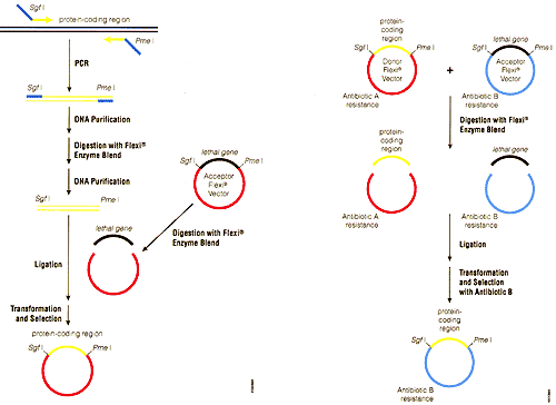 用PCR 引物将Sgf I及Pme I酶切位点添加到蛋白编码区。扩增后,纯化PCR产物以除去DNA聚合酶及引物,然后用Sgf I及Pme I消化。再次纯化DNA以除去由限制性内切酶释放的短的寡聚核苷酸。将消化的PCR 产物连接到同样经过Sgf I及Pme I消化的Flexi® 载体内。接着进行转化,使用受体Flexi® 载体的抗生素筛选细胞。