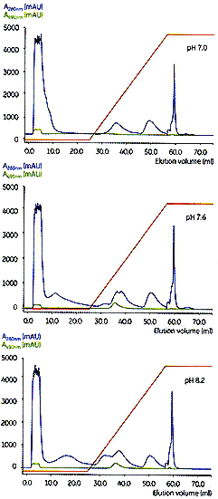 7.6和pH 8.2的层析图十分相似,但是,pH 7.6 的峰略宽。在稍高的pH下洗脱的280 nm曲线,能从GFP中分离出更多杂质。因此,pH 8.2 被确认为最佳pH 并用以进行中试。