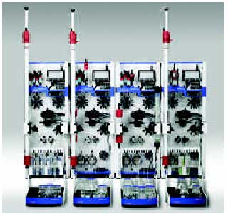 每一套ÄKTAxpress系统有一高度灵活的单元设计。标准的系统由2 个或4 个单元组成(见图1)。每一单元可以以不同的纯化流程或其它方式运行。所有的单元可以在同一流程上工作,可同时运行多达16 个样品。2 个或4 个4 单元的标准系统可以扩展到高达12个单元并仍由一个标准计算机控制。系统中嵌入的全新软件功能可以自动检测和储存多步纯化的中间产物于毛细环路中,以准备进行下一步纯化,自动洗涤、平衡或洗脱连接到该系统 |