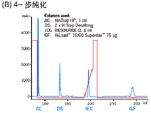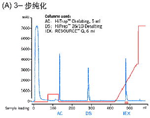 图2.(A)GFP-His6,28kDa蛋白质的三步纯化(AC-DS-IEX)。(B)MBP-His6,43