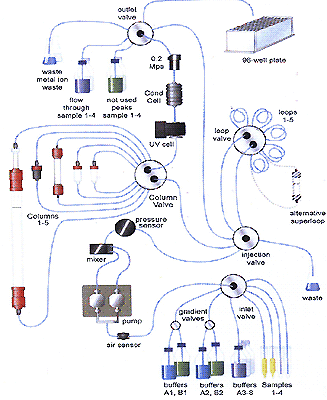 样品经进口阀并通过气泡感应器装入(见图3)。系统泵经气泡感应器将样品送到亲和柱,在洗涤步骤中融合蛋白质仍保留在该柱上,这时流经的样品由紫外检测器进行检测,并收集在另外的小型容器中(每一样品一个容器)。每一样品加到各自的亲和柱中。当所有样品加完后开始洗脱和进一步纯化。