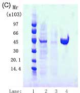 .7 kDa蛋白质的四步纯化(AC-DS-IEX-GF)。(C)图(B)中显示的四步纯化结果的考马斯染色的SDS-PAGE凝胶。