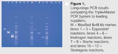 TripleMaster PCR系统在各种情形下都能够有效的扩增出PCR片段,轻松的胜过所有的竞争对手。与之效果最为接近的是罗氏公司,也需要两套扩增系统,一套定位于扩增5-20kb大小的目的片段,另外一种系统用于扩增超过20kb大小的目的片段。然而,Eppendorf公司的TripleMaster PCR系统却可以扩增覆盖它们全部大小范围内的目的片段,因此科研工作者只需要购买Eppendorf公司的一种系统即可以进行所有长程PCR反应,从而节约宝贵的时间和金钱。并且,TripleMaster PCR系统含有一个简单且易于使用的操作指南,提供的是特定而不是模棱两可的反应体系中的试剂浓度,从而避免了耗时进行优化实验。同时,TripleMaster PCR系统也可用来扩增长达50 kb的目的片段,且不需要辅助溶剂以及诸如甜菜碱(betaine)和二甲亚砜(DMSO)