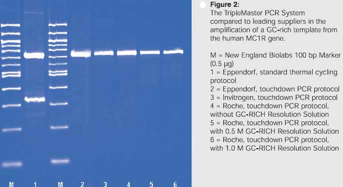 TripleMaster系统在最初的热循环条件下虽然扩增出高产量的760 bp MC1R 基因片段,但同时也扩增出一些非特异的片段(Figure 2)。当采用Touchdown PCR |