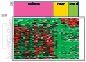 我们选择Pearson法测量距离来进行分级聚类,类似于连锁的方法。所有的恶性样本被聚类成簇而且和所有其它的样本完全分离开。一半良性样本和正常样本距离很近,而另一半则分开,但是仍然是所有的良性和正常的样本构成了各自的共同组群。