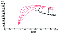 图1.重叠在一起的不同浓度的微球蛋白与鼠抗人微球蛋白相互作用的传感图.相互作用的动力学常数为Ka=2.76e5,Kd=1.21e-3。 |