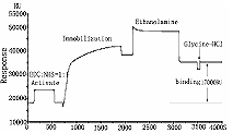 在BIACORE X的仪器上,我们描述了一个简单的,高灵敏度的鉴定与偶联在芯片上的连接子相互作用的蛋白的的方法——BIA/MS方法。它由偶联,相互作用,实时检测,微再生,酶解,MALDI-TOF MS分析和数据库搜寻鉴定等一系列方法构成,经过每一步优化处理, BIA/MS方法鉴定相互作用分子的灵敏度可以达到在fmol水平 [1,6]。