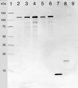 Novagen的His•Tag单克隆抗体是目前市场上独有的专门识别组氨酸残基的抗体。His•Tag® 单克隆抗体能有效检测连续5个以上组氨酸残基链,而与His附近的序列完全不相关。因此,Novagen的His•Tag® 单克隆抗体可以用来检测 任何C-端,N-端或内部带有组氨酸标签的目的蛋白。