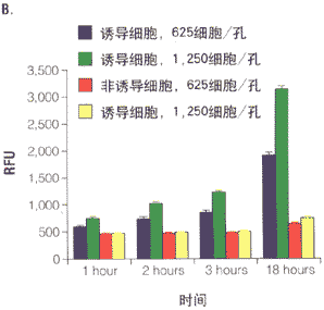 与均质Caspase-3/7试剂保温1小时后,测试625个细胞,我们可以在诱导和非诱导的细胞间检测出明显的差别(P≤0.02;学生t试验)。B图:将细胞与均质Caspase-3/7试剂的保温时间延长,可以提高测试的灵敏度,按上面描述的方法培养并处理Jurkat细胞,并使用625细胞/孔或1,250细胞/孔。同均质Caspase-3/7试剂保温的时间分别为1, 2, 3或18小时。