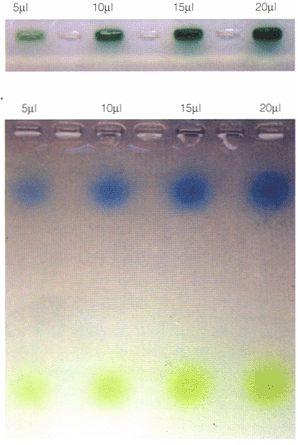 绿色GoTaqTM反应缓冲液加入琼脂糖凝胶孔。B. 电泳后的兰色和黄色染料。扩增反应物的加样体积分别为5,10,15和20μl,凝胶浓度为1%,电泳缓冲液为TE. |