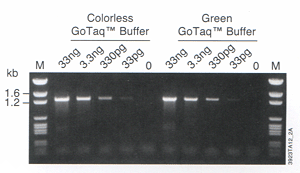 采用5X绿色和5X无色GoTaqTM反应缓冲液进行扩增,经我们检测扩增反应具有基本相同的产率和灵敏度。为了说明这一点,我们用人类基因组DNA