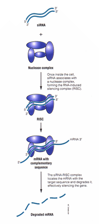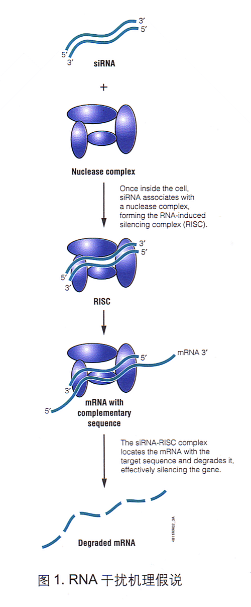 在Fire et al 1998 (1) 年发现RNAi现象后不久,dsRNA就被成功用于分析线虫,果蝇和植物的基因功能(4,5)。在哺乳动物细胞中,长链dsRNA能在小鼠胚胎肿瘤细胞和胚胎干细胞中诱导特异序列基因的沉默(6,7)。然而,向哺乳动物体细胞导入长dsRNA却可激活抗病毒防御系统,导致RNA转录子的非特异性降解(8),并使细胞丧失总体的蛋白合成功能(9,10)。这两个机制有效地关闭哺乳动物细胞的正常生理过程,而使dsRNA失去特异的RNAi能力。可是,在哺乳动物细胞中使用短的(21-23