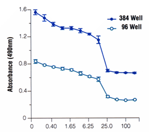 | 图6. 384孔和96孔培养板的细胞毒性分析比较。取对数生长期的小鼠杂交瘤细胞离心收集,重悬于含10%小牛血清的F12/DME培养基中。将细胞分别加入Corning®