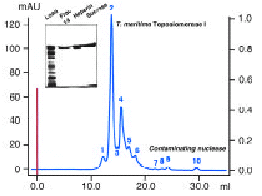 能用肝素柱或蔗糖梯度部分纯化,然而会被核酸酶影响。杂质能用uperdexTM 200 HR10/30柱除去。所用样品和峰2