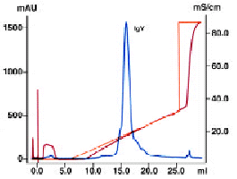 | 图4. 经过硫酸铵沉淀和透析的鸡卵黄IgY的最后纯化。残留污染的磷脂在用IgY 做蛋白质印迹之前应除去。缓冲液A:50