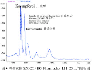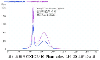 在图1中,葛根素是在第一个峰就被洗脱下来,收集后上XK 26/40 Pharmadex LH-20柱。在图2中,银杏黄酮在所有的洗脱峰都有,虽然纯化效果不理想,但经过这一步可使原有样品进行脱色和浓缩,为下一步纯化奠定了基础。