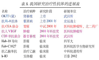 现在美国已有十多种治疗性抗体上市 (表2)。我国继抗OKT3和外用抗IL-8抗体问世之后,抗肝癌 (Hab-18) 和抗转移性乳腺癌抗体 (H-R3) 均已进入二期临床阶段 (表3)。这些进展将给广大患者带耒新的福音。