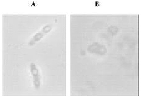 图2. A:E.coli细胞内含有表达的scFv57P融合蛋白质;B:Frenchpress破碎后的匀浆,均用相差显微镜观察得到。