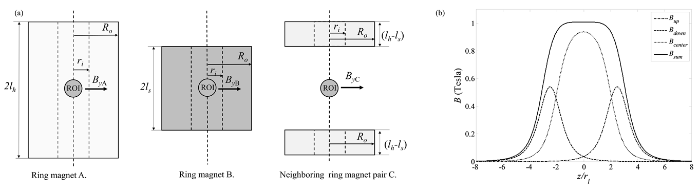 图1. 研究提出的多层Halbach阵列磁体理论模型(a)及磁场均匀性补偿模型(b)