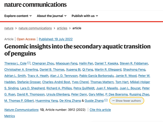 “通过这些数据,我们有机会全面地揭示企鹅的物种形成和灭绝过程。现生企鹅的共同祖先出现在大约1400万年前,之后气候环境的变化推动了企鹅物种的快速分化,在分化过程中还伴随着复杂的基因流动,这些对现生企鹅的形态多样性的塑造造成了巨大的影响。”论文通讯作者、浙江大学生命演化研究中心张国捷教授总结道,“本项工作综合了古生物,基因组,古环境气候等信息,完整的刻画了一大类群物种的宏观演化过程,阐述了推动这一过程的内在遗传和外在环境因素的影响,将为更多研究提供参考。这是探索生命演化和环境适应迈出的重要的一步,也是新的开始。”