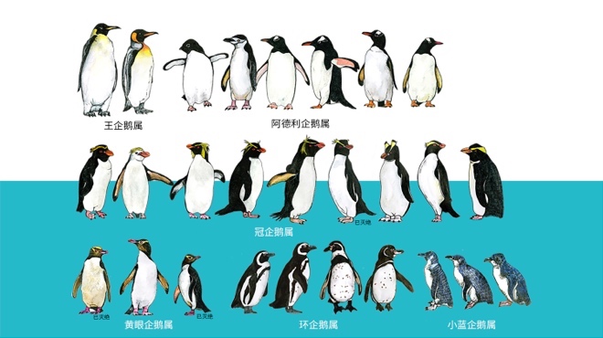 如今,地球上一共生存着约24种企鹅,共计6个分支,分别为王企鹅属、阿德利企鹅属、环企鹅属、小蓝企鹅属、冠企鹅属和黄眼企鹅属。但在过去相当长的时间里,人们未能完全理解企鹅6个分支之间的关系,再加上从化石中发现的另外28个分支,更是增加了理顺企鹅演化关系的难度。