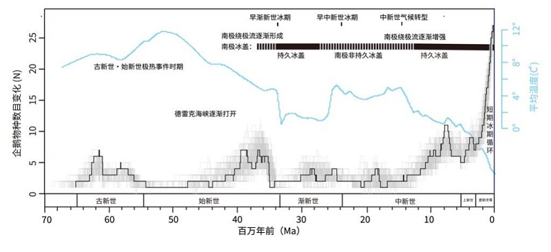 图注:企鹅物种数目变化与典型的气候事件(周程冉绘,参考Zachos et al., 2001)