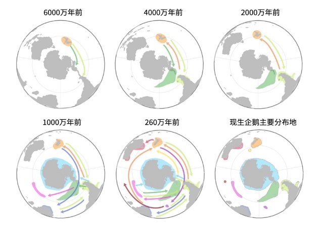 图注:企鹅的历史分布及推测的扩散情况,箭头为企鹅可能的扩散路径,彩色区域为企鹅的分布范围(周程冉绘)