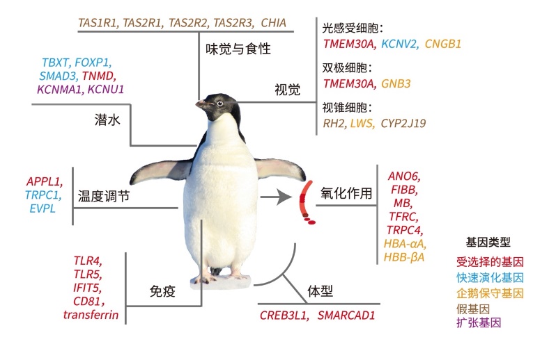 图注: 企鹅功能基因展示 (周程冉和方妙全绘,照片来自pixabay)