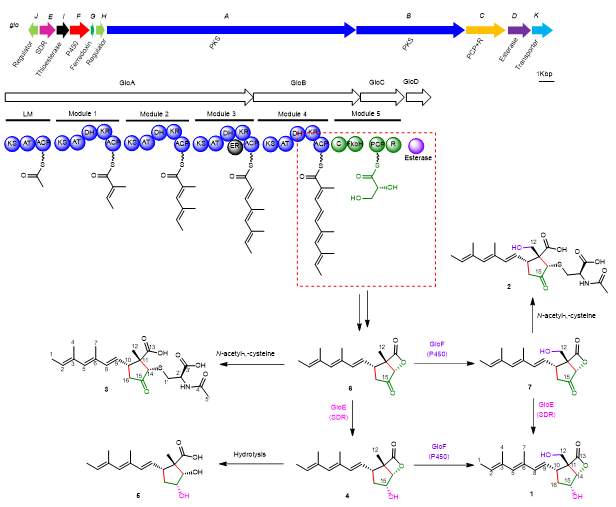 根据文献报道,仅有3例β-内酯类化合物的成环机制被研究清楚:obafluorin,vibralactone和salinosporamide A。Globilactone A中独特的双环结构促使研究人员对其生物合成过程展开了研究。通过基因敲除和代谢产物分析,研究人员对其生物合成过程进行了推测,主要包括两个方面,一个是装配线上的骨架形成过程,另一个是线下的后修饰过程。根据突变菌株中的代谢产物分离及体外酶反应实验表明,线下的后修饰过程包括C15位羰基的还原,由短链脱氢酶GloE催化;以及C12位的羟基化,由P450蛋白GloF负责。当C15位羰基未被还原时,β-内酯环容易被N-乙酰基-半胱氨酸进攻开环,形成对应的化合物2和3(图1)。