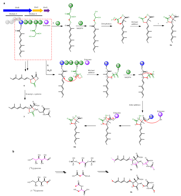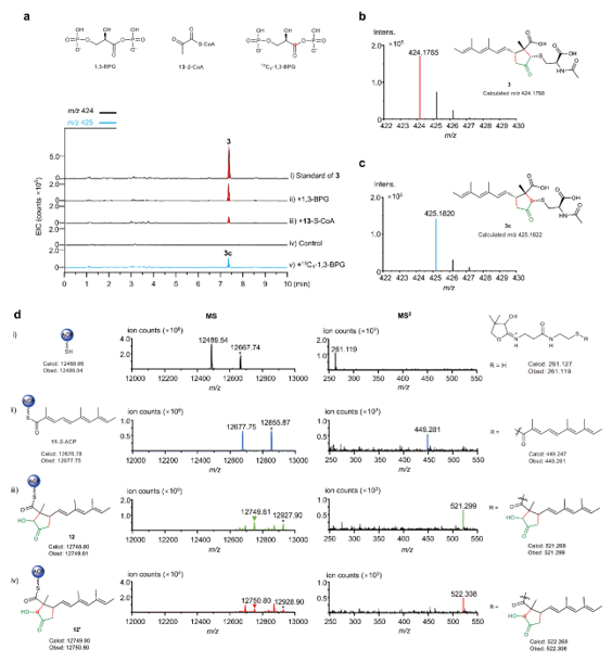 为了进一步研究其双环结构的成环机制,研究人员表达了相关蛋白,并合成了对应的线性聚酮链作为底物进行酶反应,成功在体外重构了化合物3的生成(图3a)。同时,研究人员将合成的标记的甘油酸作为1,3二磷酸甘油酸的前体进行了酶反应,得到了对应的标记产物3c和中间体12’,进一步证实了该反应中间体(图3d)。