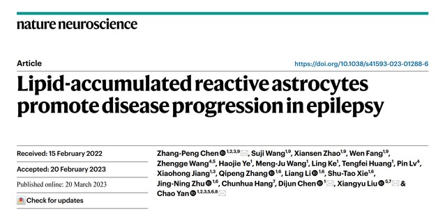 该研究成果以 “Lipid-accumulated reactive astrocytes promote disease progression in epilepsy” 为题,于 2023 年 03 月 20 日发表于神经科学领域顶级期刊 Nature Neuroscience