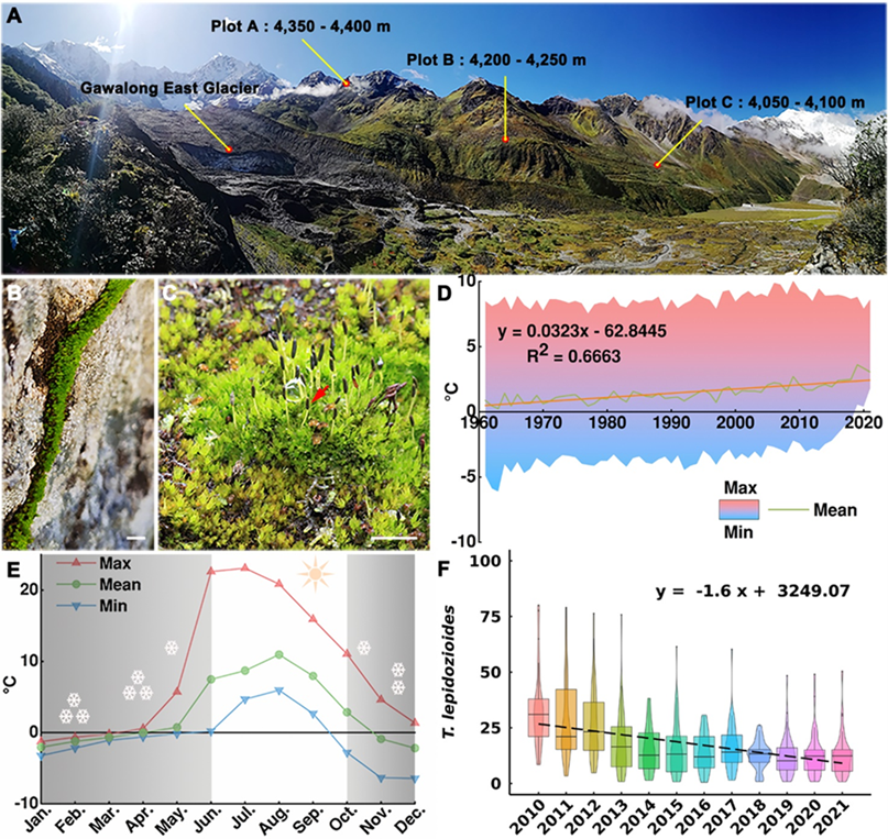 图1,藻苔分布区域气候和种群动态。A藻苔种群分布点,西藏波密县的嘎瓦隆东冰川附近区域(北纬Lat 29°45′ N, 东经Long 95°42′ E, 海拔3800-4400米),B-C藻苔植株长出成熟孢蒴,D实验场地气温变化,E实验场地温度和雪覆盖苔藓植被情况,F藻苔种群覆盖度变化。