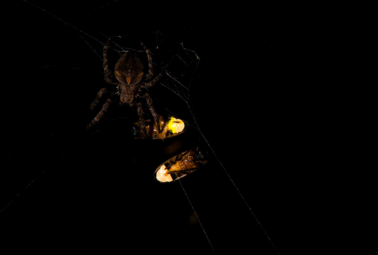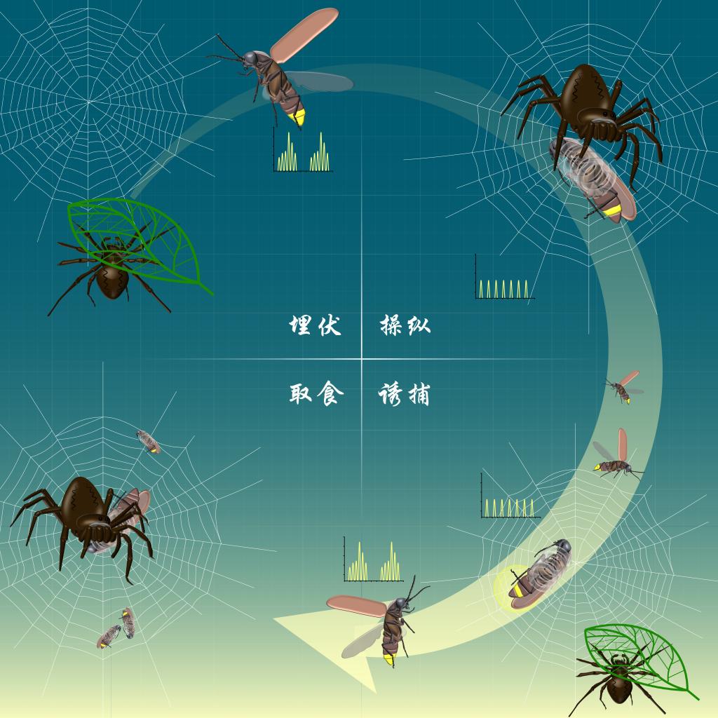 团队发现,常见的结网型蜘蛛——大腹园蛛,会操纵触网的雄性边褐端黑萤,通过缠绕和注射微量毒素使其产生变化。被操纵边褐端黑萤原本用两节发光器在空中飞行发出多脉冲的雄性展示求偶信号,但在蜘蛛的操纵下,它们只用一节发光器闪光,模拟雌性求偶单脉冲信号,从而吸引更多雄萤前来求偶交配,最终触网被捕。