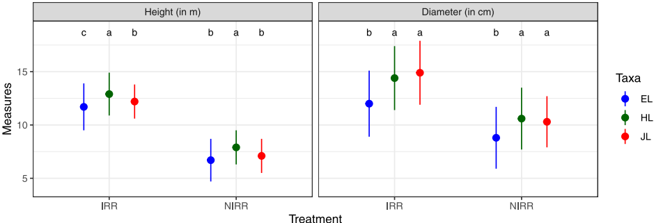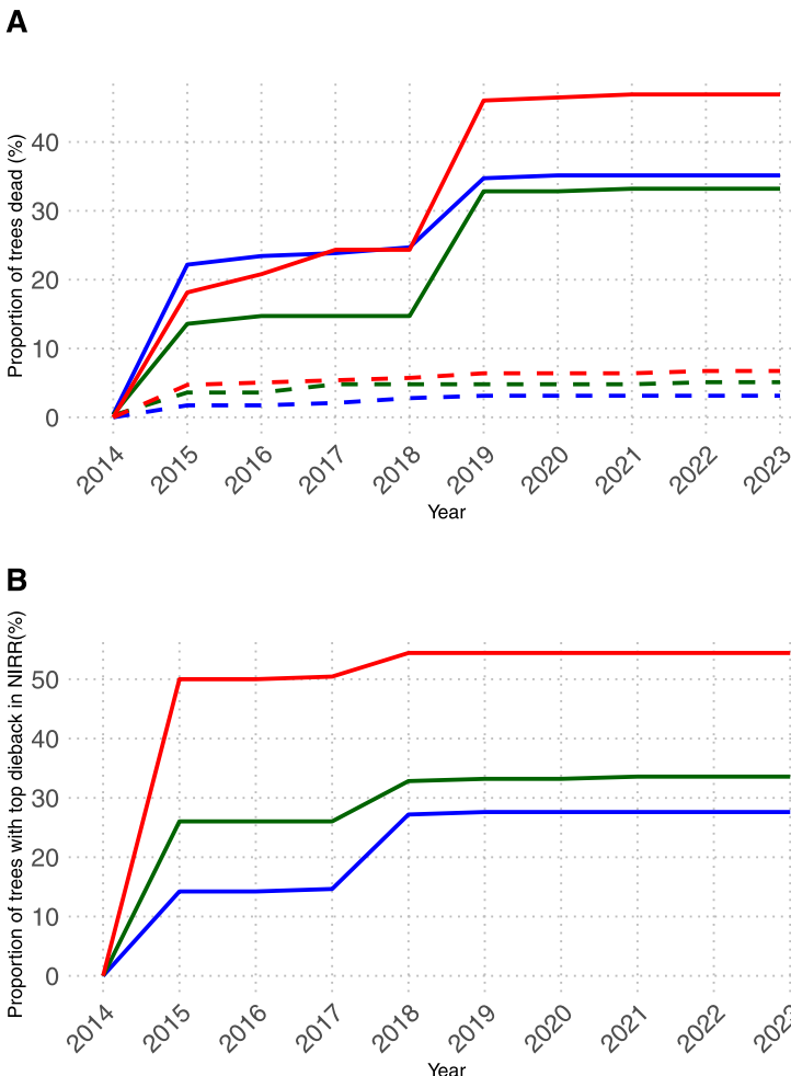 日本落叶松在非灌溉区死亡率最高(45%),显著高于欧洲落叶松(35%)和杂交种(30%)。灌溉几乎消除所有死亡率(IRR<5%)。2015和2019年干旱事件导致死亡率峰值,与高温和VPD异常相关。